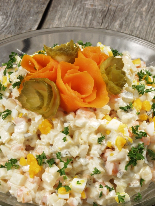 Mix the sour cream and mayonnaise together into a sauce, season with salt and pepper. Pour the sauce onto the salad and mix up gently. Let the salad season for a few hours.