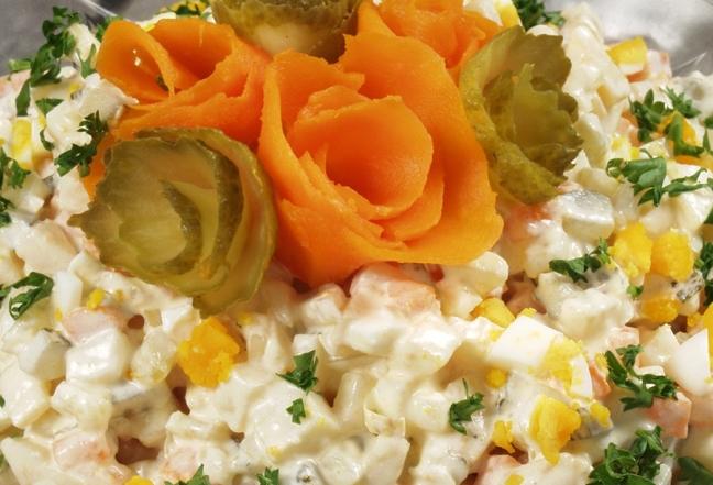 Boil the unpeeled potatoes soft in salted water. Let them cool down completely. To make the salad, peel the boiled potatoes and chop into fine cubes. Mince the onion. Chop the boiled and cooled eggs (leave one egg to garnish the salad) and pickles into fine cubes.