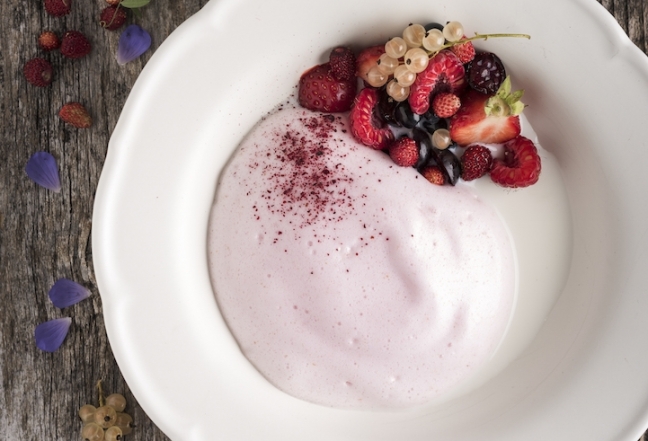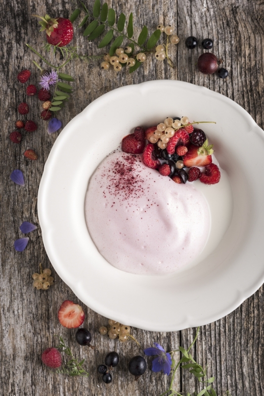 Dilute 200 ml of concentrated juice with water and season with sugar. Bring the juice to the boil and add the semolina while constantly stirring. Boil on low heat for about 10–15 minutes, until the semolina has expanded. The porridge must be rather liquid, like a soup, for making a mousse. Let it cool down a little and whisk into a fluffy foam with a mixer. Serve with cold milk and berries.