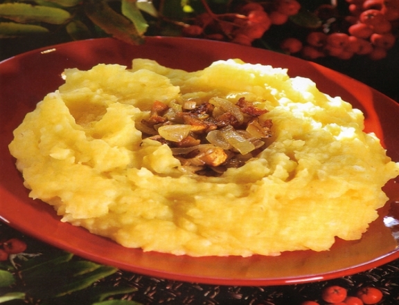 Meat is cut into cubes and fried. Chopped onion is added, which is boiled until golden yellow. Fried meat and onions could be stirred into the porridge or put on the porridge.