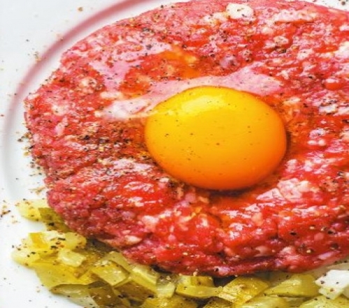 Clean the meat, wash it in water and dry. Chop finely with a sharp knife. Season with mustard and freshly ground black pepper. Add oil. Let cool. Shape into the desired form and place onto a plate. Put a yolk on top. Dice the pickled cucumbers and the onion finely and serve on the side, together with a slice of whole-grain bread. Optionally, add capers and marinated mushrooms.