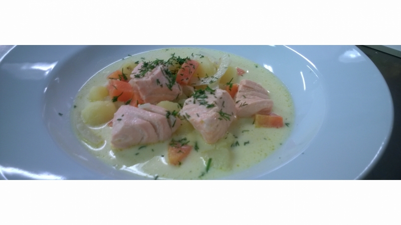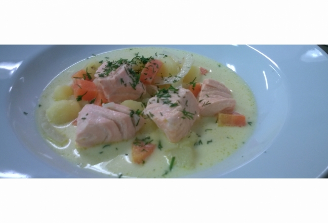 Simmer chopped onions in a butter. Add peeled and diced potatoes and continued simmering. Add fish stock and cream. Wrapped spices and rye bread to a food cloth and add it to a soup base. When potatoes are almost ready, add diced salmons. Let it simmer until potatoes and salmon is cooked. Remove food cloth. Add salt and chopped dill.