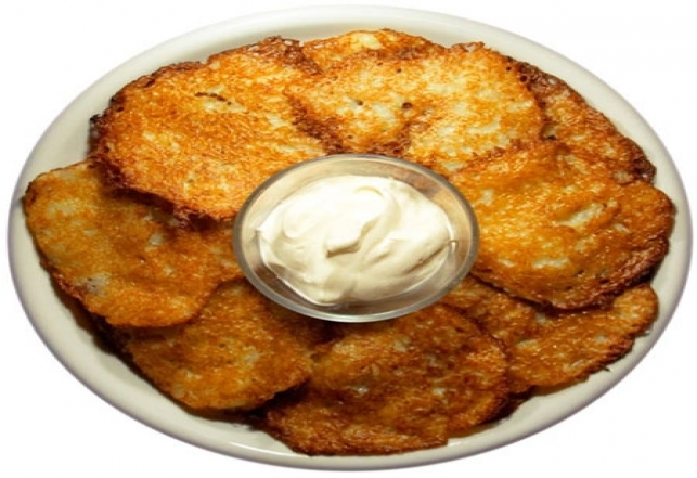 Peel and grate potatoes. Mix in other ingredients. Melt fat or heat 1 tablespoon cooking oil in frying pan. Drop spoonfuls of mixture onto hot skillet. Brown each side to a golden brown. Serve with sour cream.